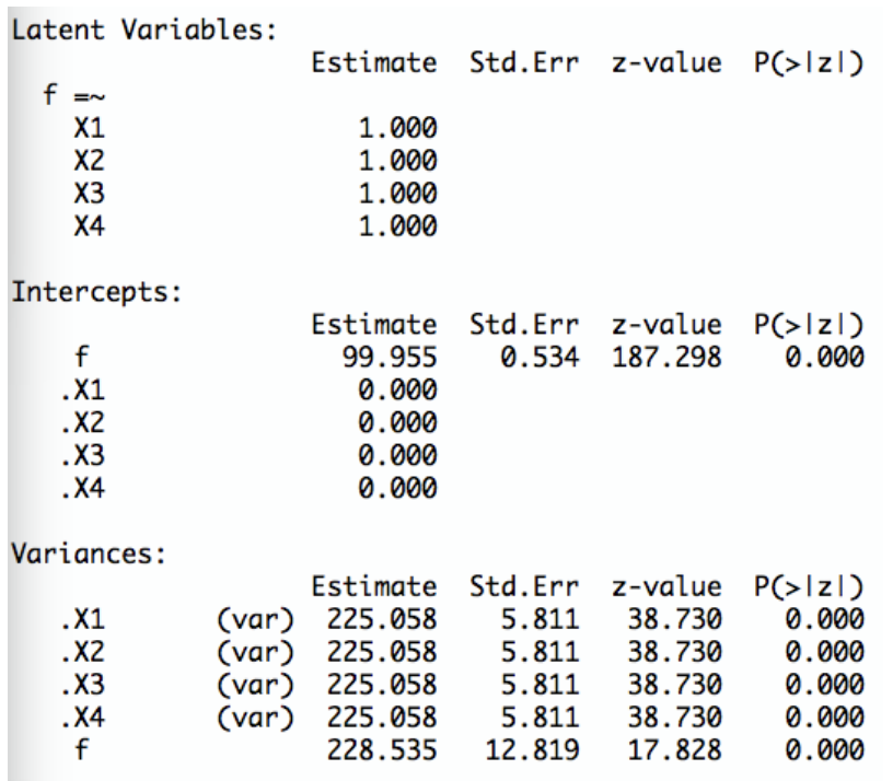 Sie betrachten einen Test mit vier Items, von denen Sie aus vorangehenden Modelltests wissen, dass Sie einem parallelen Modell folgen. Sie erhalten folgenden Output mit Schätzwerten für die Parameter des Modells: