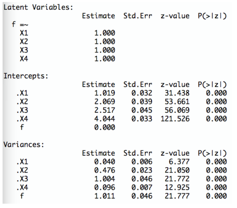 Dies sind die Schätzwerte für die Erwartungswerte der vier ItemsWas sind die Schätzwerte für die Varianzen \(Var(\epsilon_{i})\) der Fehlervariablen?