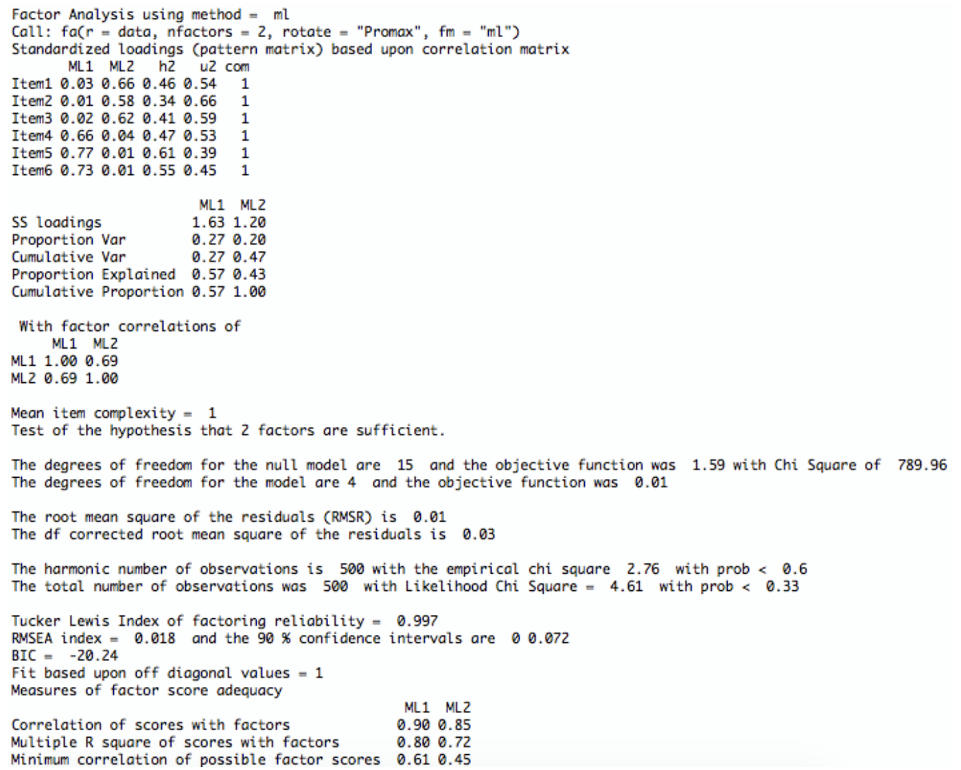 - Die orthogonale Rotation ist Spezialfall der obliquen Rotation: Falls die Faktoren tatsächlich nicht korrelieren und wir eine oblique Rotation durchführen, erhalten wir sehr ähnliche Ladungen wie bei einer orthogonalen Rotation und die Schätzwerte für die Korrelationen sind sehr nahe an Null. Wenn also eine Theorie annehmen würde, dass die Faktoren unkorreliert sind, können wir mit einer obliquen Rotation feststellen, ob diese Annahme plausibel ist.