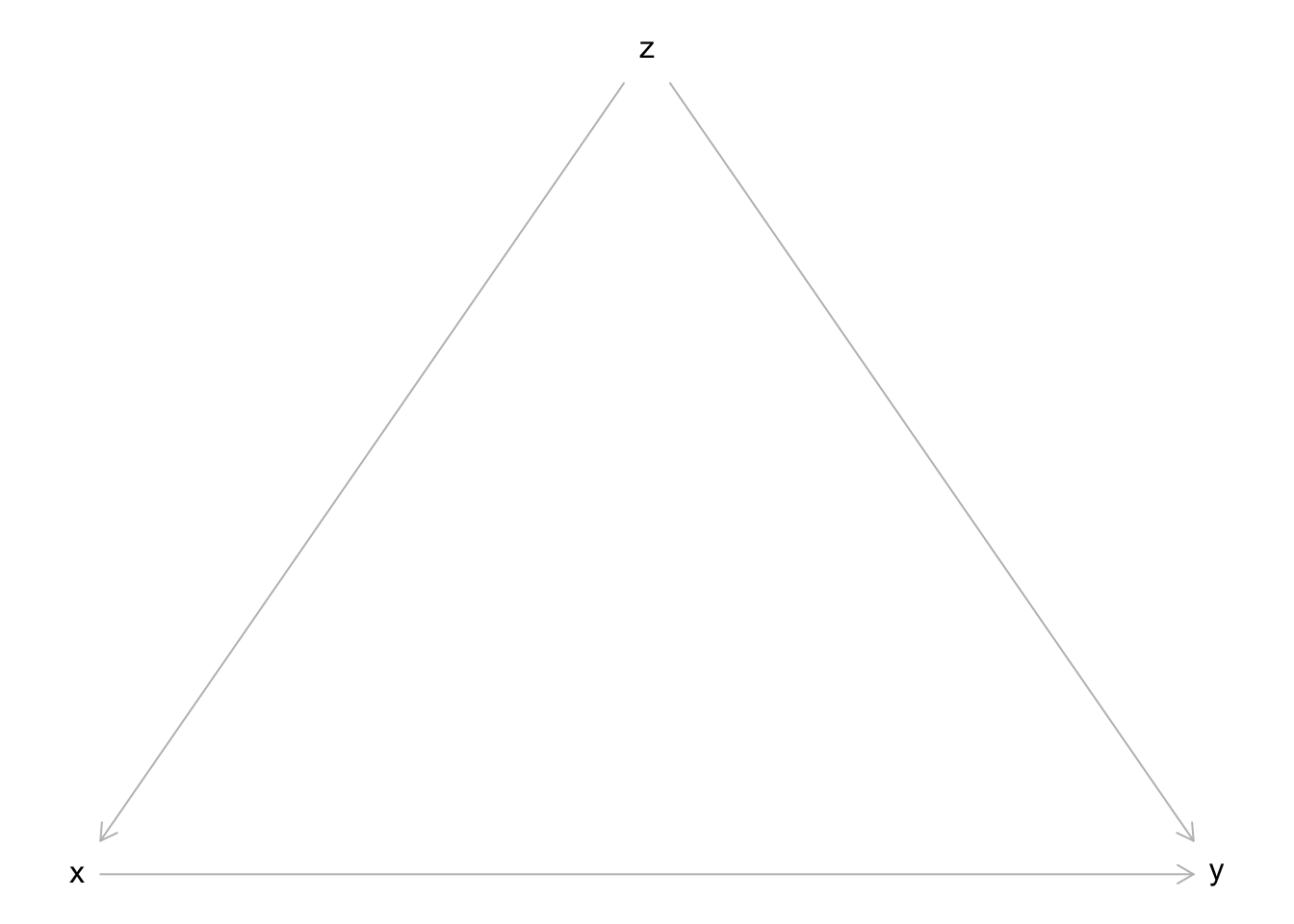 Wenn wir uns für den kausalen Effekt von X auf Y interessieren, können wir auch hier mithilfe des sogenannten Backdoor Kriteriums visuell entscheiden, für welche Variablen kontrolliert werden sollte. Wenn wir diese Regeln selbst nicht beherrschen (oder zu faul sind), können wir auch den DAG mithilfe des dagitty Pakets in R analysieren und das Paket die Kontrollvariablen nach den mathematischen Gesetzen der kausalen Inferenz automatisch bestimmen lassen.