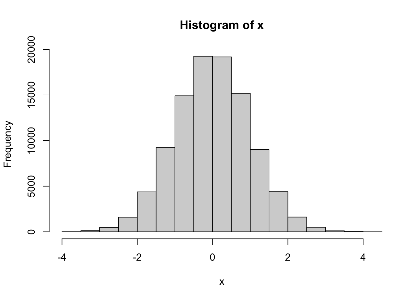 Der Vektor x enthält 100000 zufällige, unabhängige Ziehungen aus einer Standardnormalverteilung: \[X_i \sim N(0, 1)\] Das Histogramm der Werte in x zeigt die typische “Glockenkurve”: