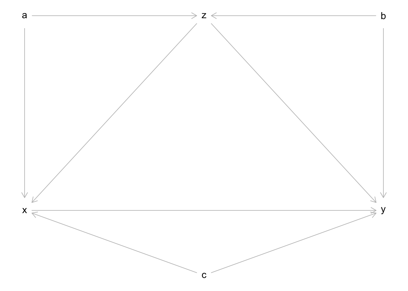 adjustmentSets(dag, exposure = "x", outcome = "y", effect = "total"){ b, c, z }