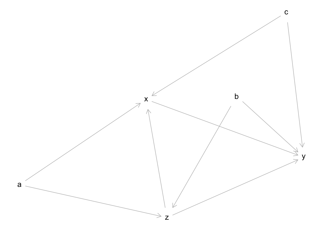 plot(dag)Plot coordinates for graph not supplied! Generating coordinates, see ?coordinates for how to set your own.