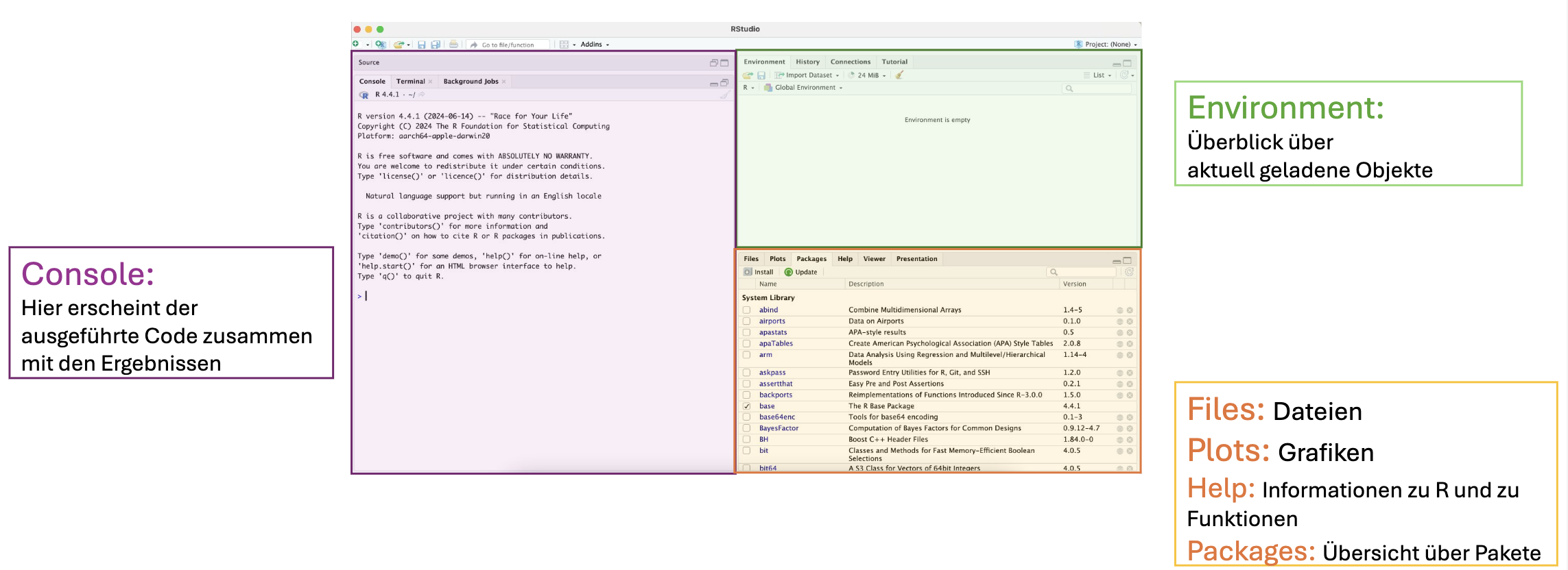 Als nächstes öffnen wir RStudio, indem wir auf die RStudio Verknüpfung auf dem Desktop, im Startmenü bei Windows oder im Finder unter Programme bei Mac klicken. Wenn wir RStudio zum ersten mal öffnen, gliedert sich die Ansicht in die folgenden drei Bereiche: