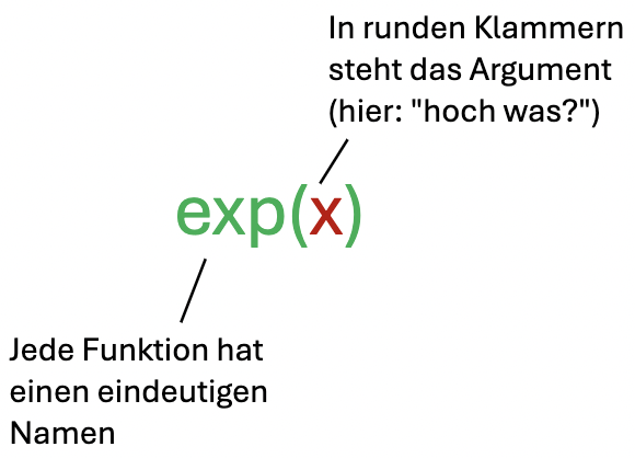 Wir haben bereits gesehen, was Funktionen und Argumente sind. Dabei haben wir mathematischen Funktionen wie exp() kennengelernt, sowie die Funktion round() oder die Funktion c() zur Erstellung von Vektoren.