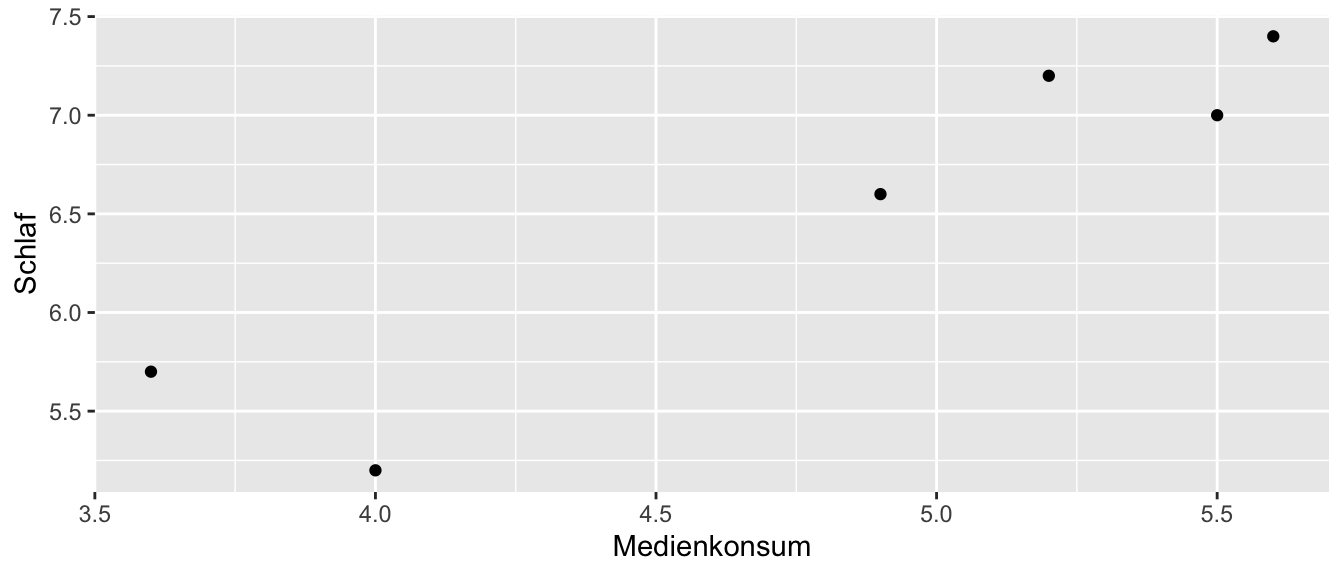 Medienkonsum in Stunden/Tag \(z_{Medienkonsum}\) Schlaf in Stunden \(z_{Schlaf}\) Schüler 1 3.6 -1.60 5.7 -1.01 Schüler 2 5.2 0.53 7.2 0.84 Schüler 3 5.5 0.93 7.0 0.60 Schüler 4 5.6 1.07 7.4 1.09 Schüler 5 4.0 -1.07 5.2 -1.63 Schüler 6 4.9 0.13 6.6 0.10 Überprüfen Sie Ihr Ergebnis auch, indem Sie den Mittelwert der \(z\)-Werte \(z_{x_i}\) bzw. \(z_{y_i}\) berechnen. Welcher Wert sollte (nach Rundung ungefähr) dabei herauskommen?