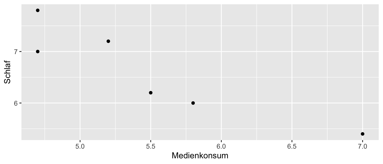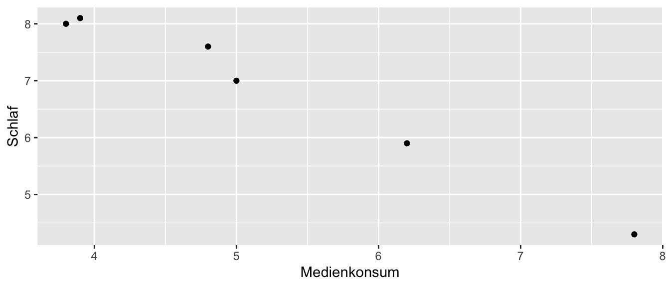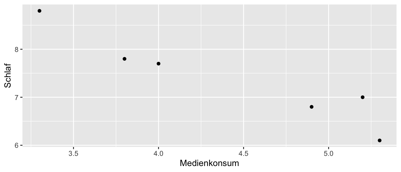 \[ \begin{align*} {cov}_{emp}(x,\ y) &= \frac{1}{n}\sum_{i = 1}^{n}\left( x_{i} - \bar{x} \right)\left( y_{i} - \bar{y} \right) \\ &= \frac{1}{6}\sum_{i = 1}^{6}\left( x_{i} - 4.82 \right)\left( y_{i} - 7.15 \right) \\ &= \frac{1}{6}\left\lbrack \left( x_{1} - 4.82 \right)\left( y_{1} - 7.15 \right) + \left( x_{2} - 4.82 \right)\left( y_{2} - 7.15 \right) + \ldots + \left( x_{5} - 4.82 \right)\left( y_{5} - 7.15 \right) \right\rbrack \\ &= \frac{1}{6}\left\lbrack (5.5 - 4.82)(6.7 - 7.15) + (3.9 - 4.82)(7.7 - 7.15) + \ldots + (3.7 - 4.82)(8.2 - 7.15) \right\rbrack = -0.7 \end{align*} \] Da an der Kovarianz lediglich die Richtung des Zusammenhangs abgelesen werden kann, können wir nur sagen, dass ein gegengerichteter Zusammenhang der Variablen Medienkonsum und Schlaf vorliegt.