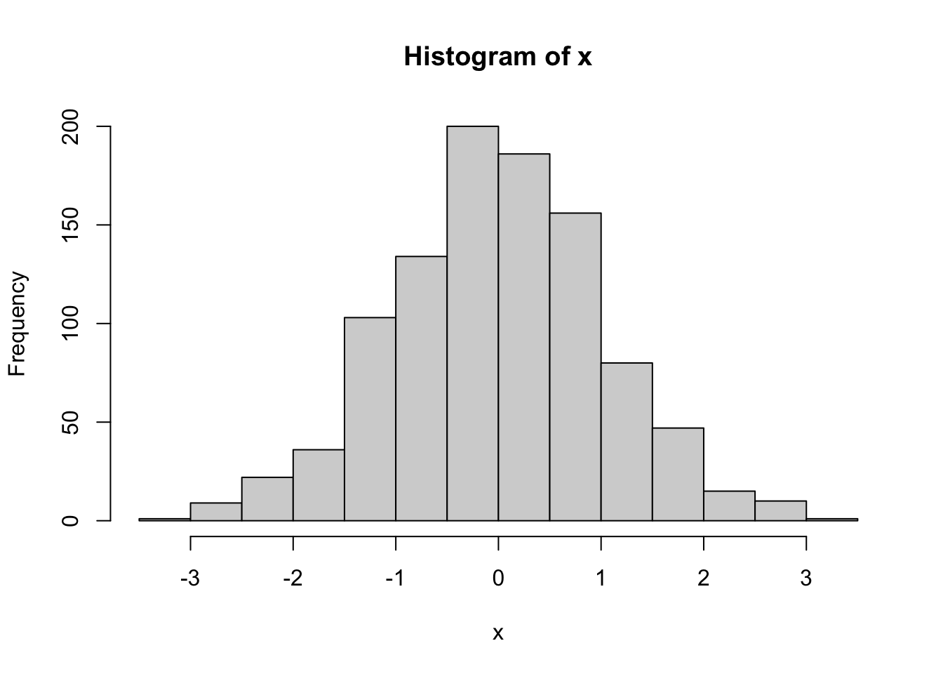 x <- rnorm(n = 1000, mean = 0, sd = 1)