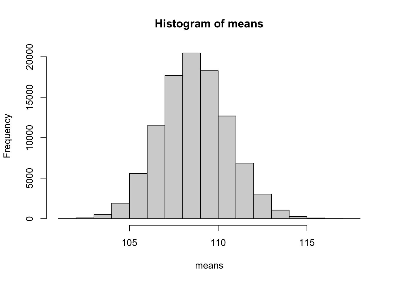 • Berechnen Sie die relative Häufigkeit der Stichproben, in denen der Schätzwert weniger als 1 IQ Punkt von \(\mu\) abweicht. Vergleichen Sie das Ergebnis mit der Wahrscheinlichkeit für dieses Ereignis (Berechnung mithilfe von pnorm() unter Berücksichtigung der Verteilung der Schätzfunktion).