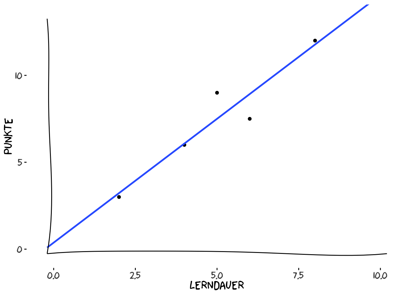 Aufgrund der besseren Eigenschaften der Korrelation, können wir hier auch die Stärke des Zusammenhangs sinnvoll bewerten. Es liegt ein starker gleichgerichteter linearer Zusammenhang der Variablen Lerndauer und Klausurpunkte vor.