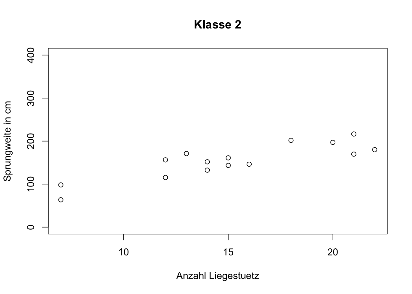 TippLösung## Streudiagramm Klasse 1 plot(Daten1$liegestuetz, Daten1$sprungweite_cm, main = "Klasse 1", xlab = 'Anzahl Liegestuetz', ylab = 'Sprungweite in cm', ylim = c(0, 400))