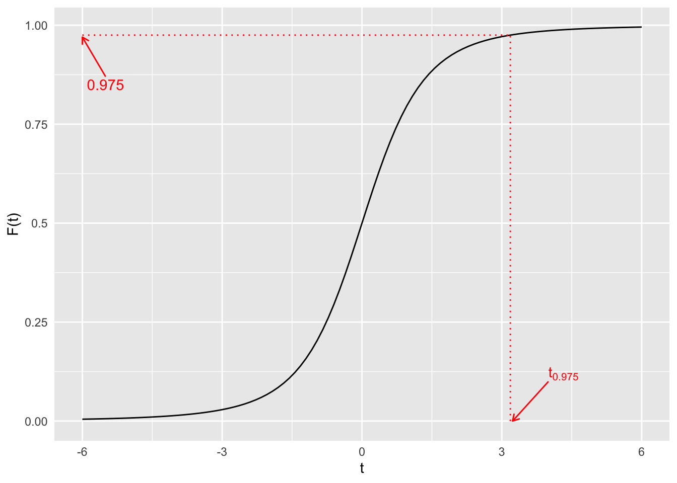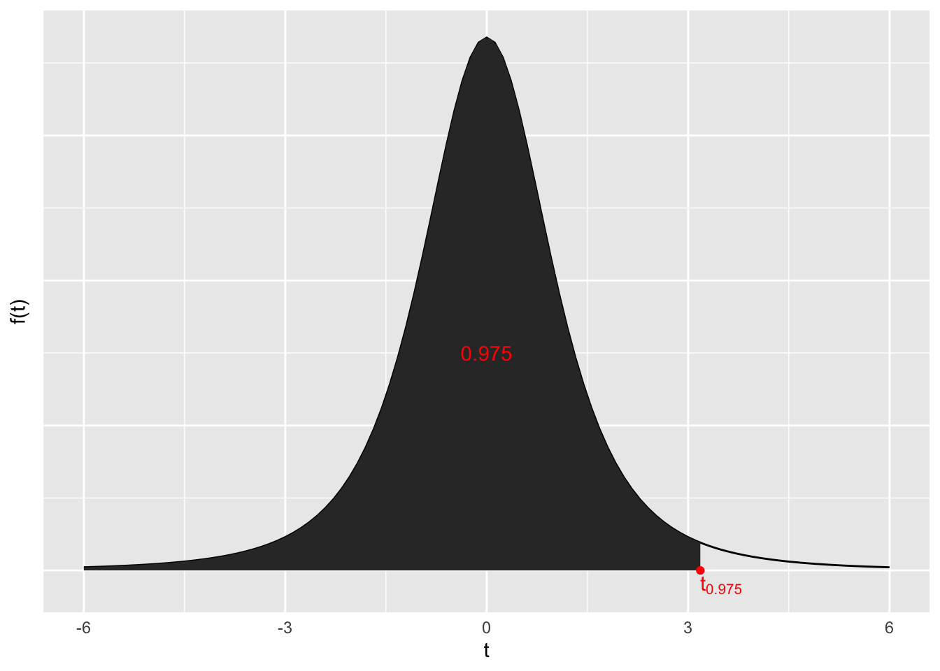 Dies ist der Wert für den unter einer t-Verteilung mit \(\nu = n - 1 = 4 - 1 = 3\) gilt, dass \(F\left( t_{0.975} \right) = 0.975\).