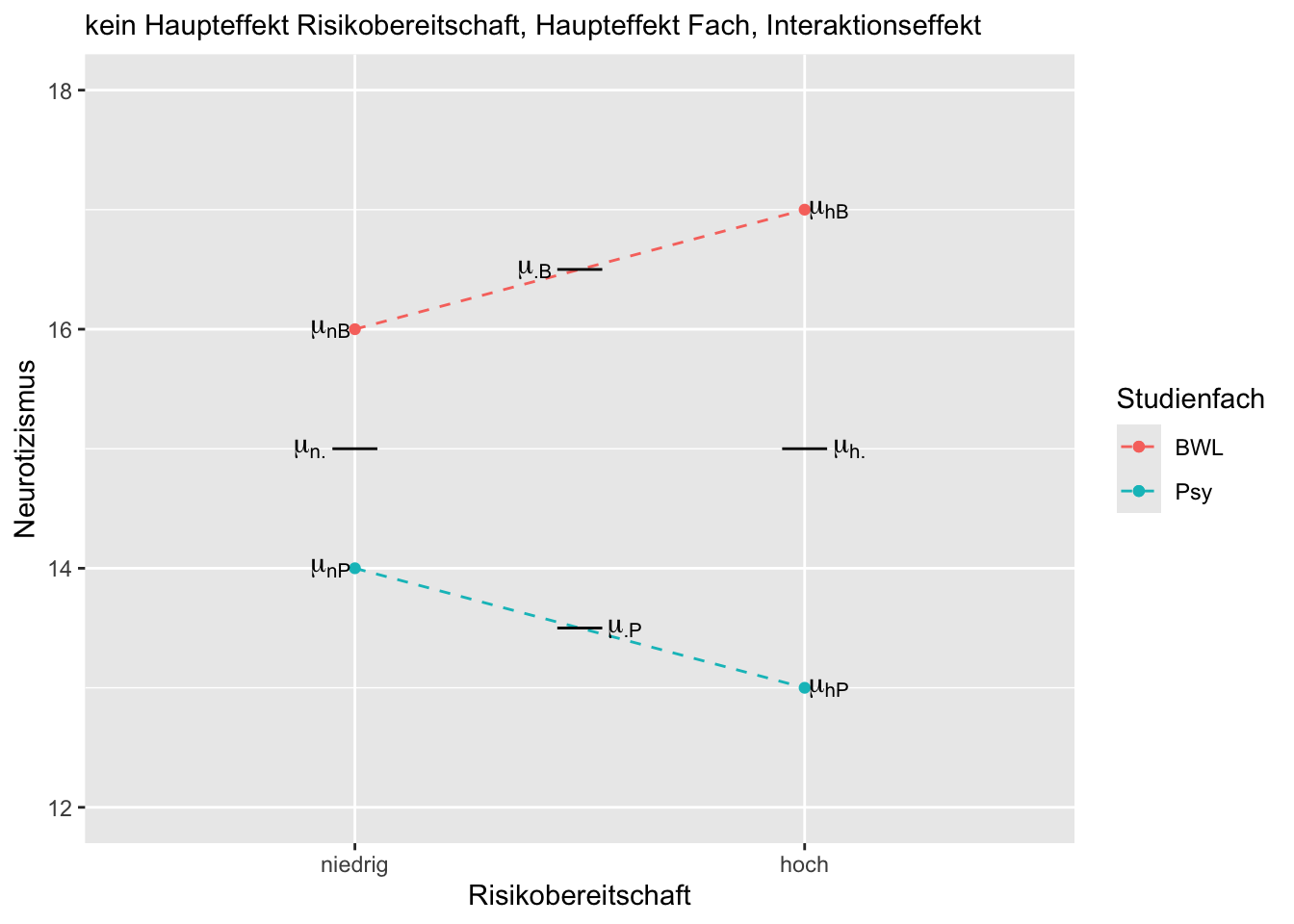 Bei dem eingezeichneten Profilplot liegt keine Interaktion von Risikobereitschaft und Studienfach vor, da \(\mu_{nP} - \mu_{hP} = \mu_{nB} - \mu_{hB}\) bzw. \(\mu_{nP} - \mu_{nB}= \mu_{hP} - \mu_{hB}\). Es liegt kein Haupteffekt Studienfach vor, da \(\mu_{\cdot P} = \mu_{\cdot B}\). Es liegt kein Haupteffekt Risikobereitschaft vor, da \(\mu_{n \cdot} = \mu_{h \cdot}\).