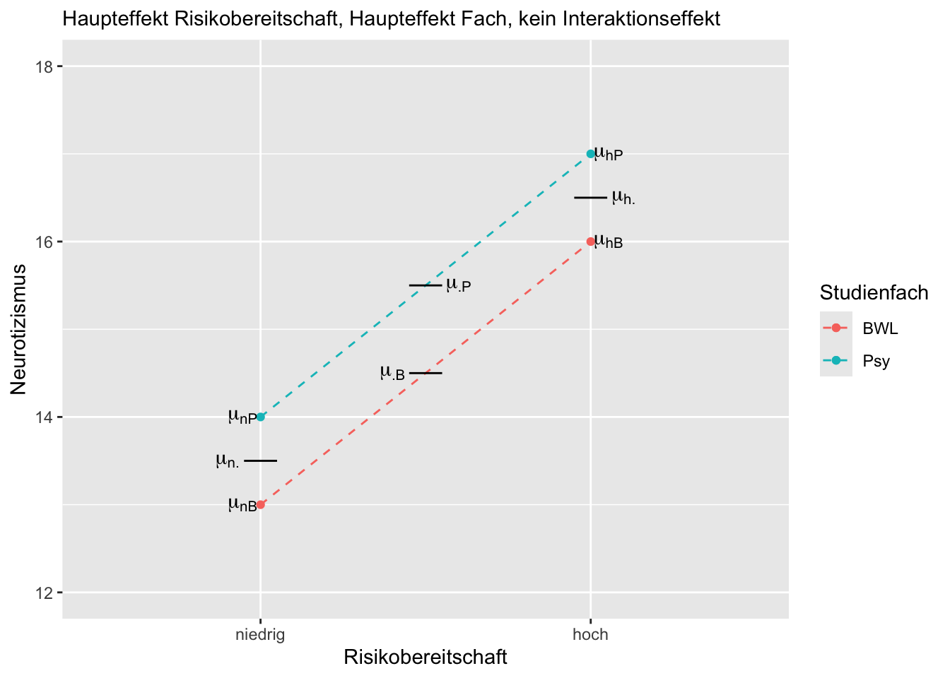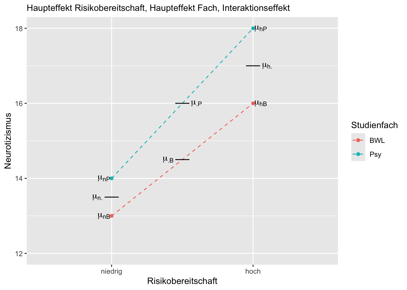 Bei dem eingezeichneten Profilplot liegt keine Interaktion von Risikobereitschaft und Studienfach vor, da \(\mu_{nP} - \mu_{hP} = \mu_{nB} - \mu_{hB}\) bzw. \(\mu_{nP} - \mu_{nB}= \mu_{hP} - \mu_{hB}\). Es liegt kein Haupteffekt Studienfach vor, da \(\mu_{\cdot P} = \mu_{\cdot B}\). Es liegt ein Haupteffekt Risikobereitschaft vor, da \(\mu_{n \cdot} \neq \mu_{h \cdot}\).