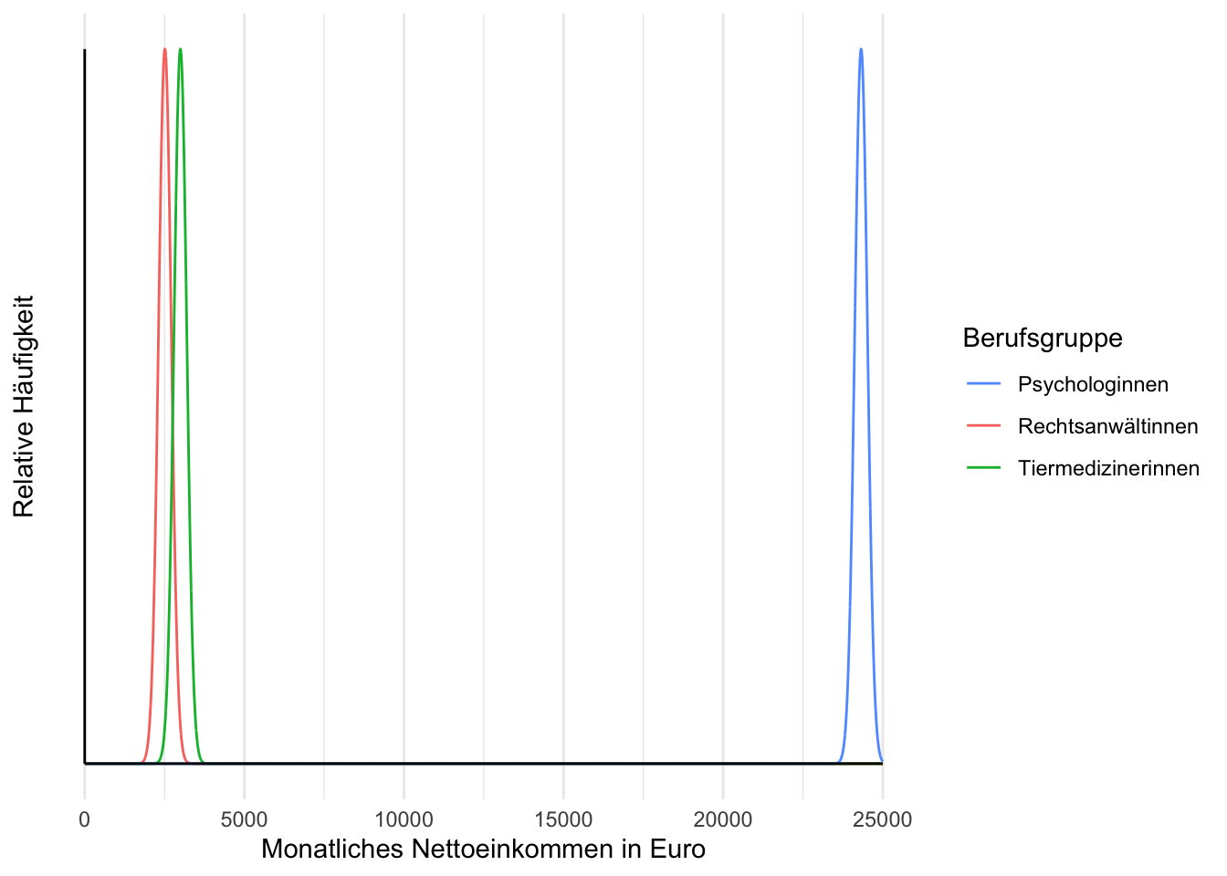 Rechtsanwältinnen haben ein geschätztes durchschnittliches monatliches Nettoeinkommen von 2512 Euro, Psychologinnen von 24321 Euro und Tierärztinnen von 2997 Euro. Die geschätzte empirische Standardabweichung des durchschnittlichen monatlichen Nettoeinkommens innerhalb der Gruppen beträgt 20.59 Euro.