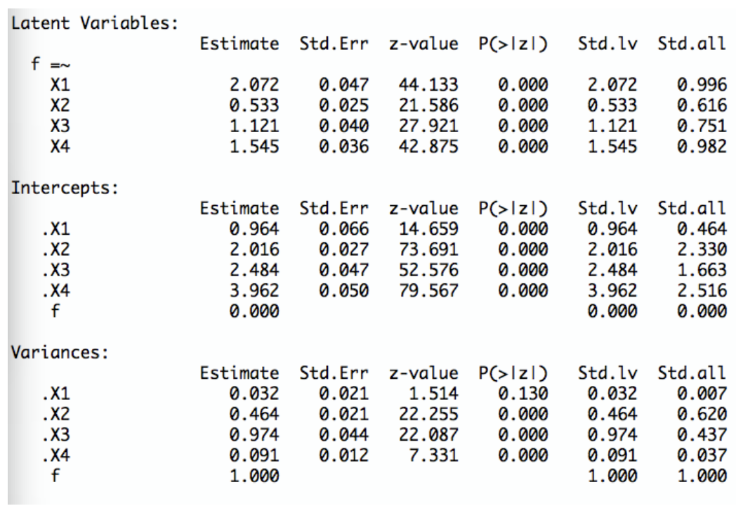 Dies sind die Schätzwerte für die Erwartungswerte der vier ItemsWas sind die Schätzwerte für die Varianzen \(Var(\epsilon_{i})\) der Fehlervariablen?