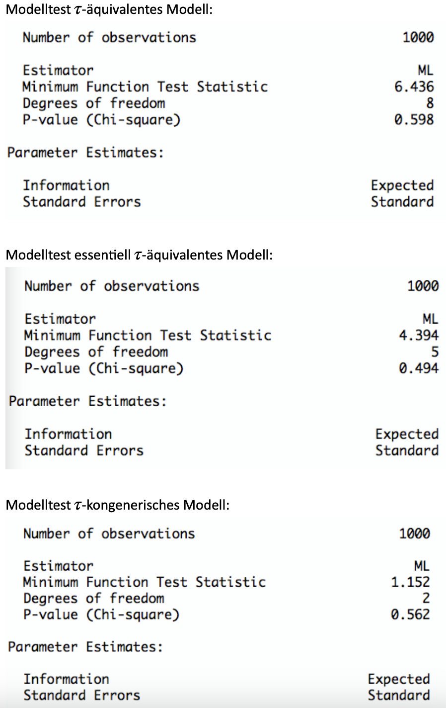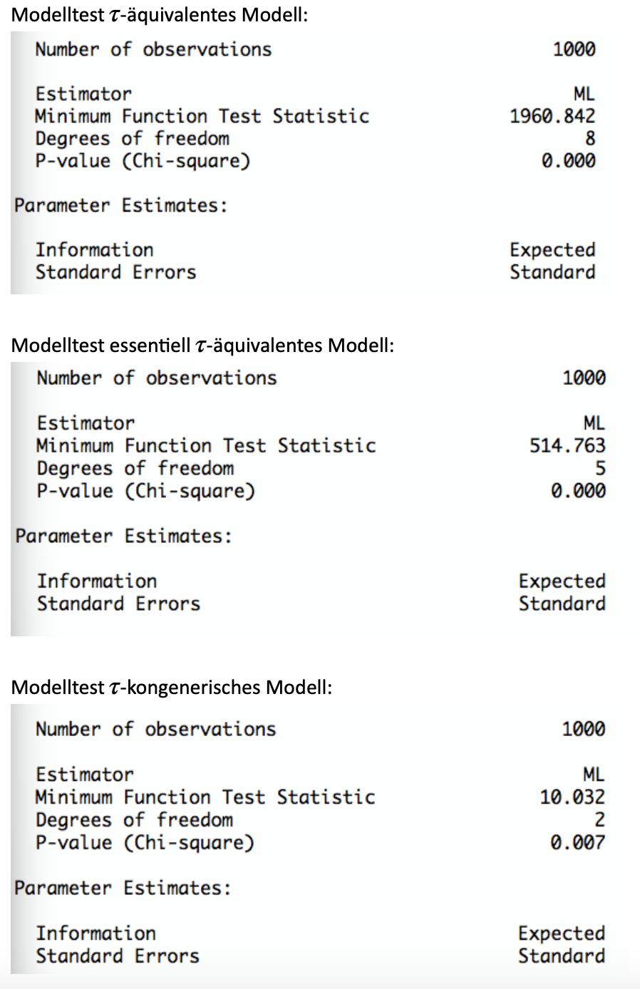 Nicht abgelehnt werden \(\tau\)-äquivalentes, essentiell \(\tau\)-äquivalentes und \(\tau\)-kongenerisches Modell, da hier die p-Werte > 0.05 sind.Weiteres Vorgehen: