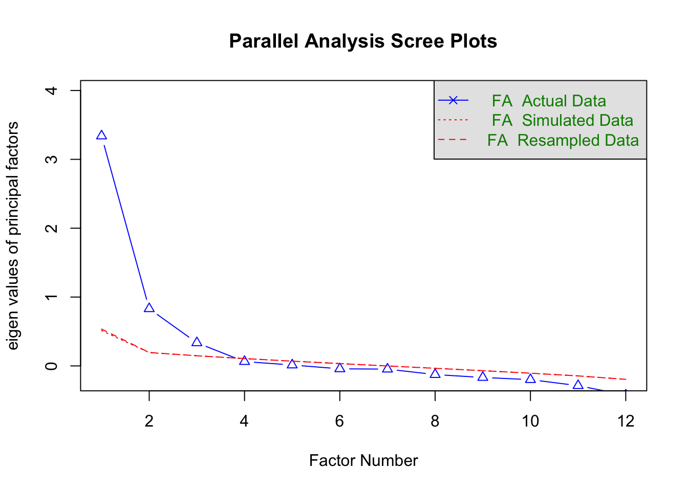 Das bedeutet: Die Parallelanalyse geht davon aus, dass drei Faktoren hinter unseren Extraversionsitems stecken – und nicht nur eine latente Variable, wie wir vielleicht erwartet hätten.