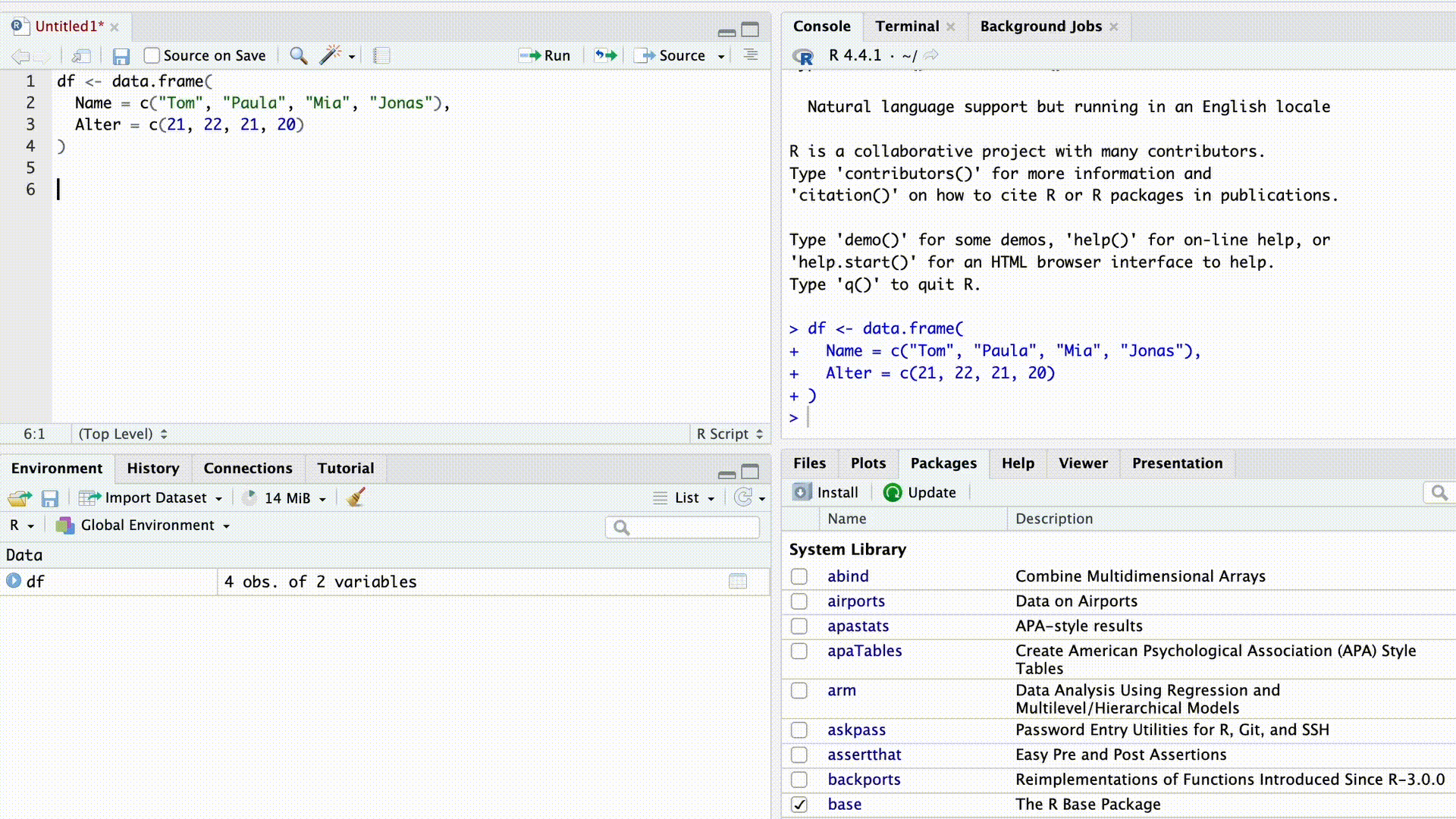 Wenn wir einen größeren Datensatz haben als unser Beispiel und nur die ersten oder letzten sechs Zeilen ansehen wollen, können wir das mit head() oder tail(). Da df in unserem Beispiel nur vier Zeilen hat, ist das in diesem Fall sinnfrei.