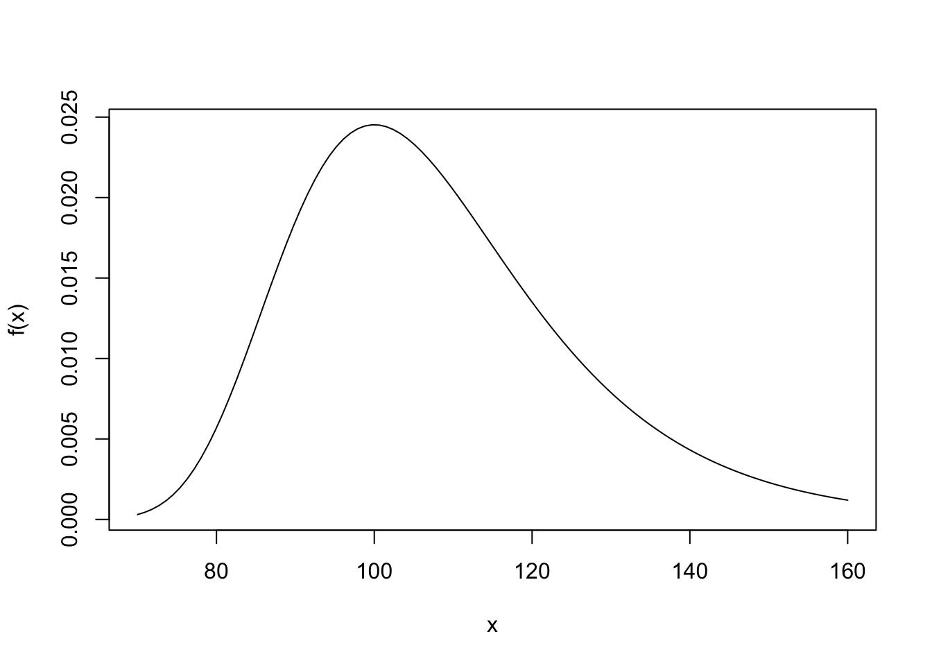 curve(dgumbel(x, location = 100, scale = 15), from = 70, to = 160,