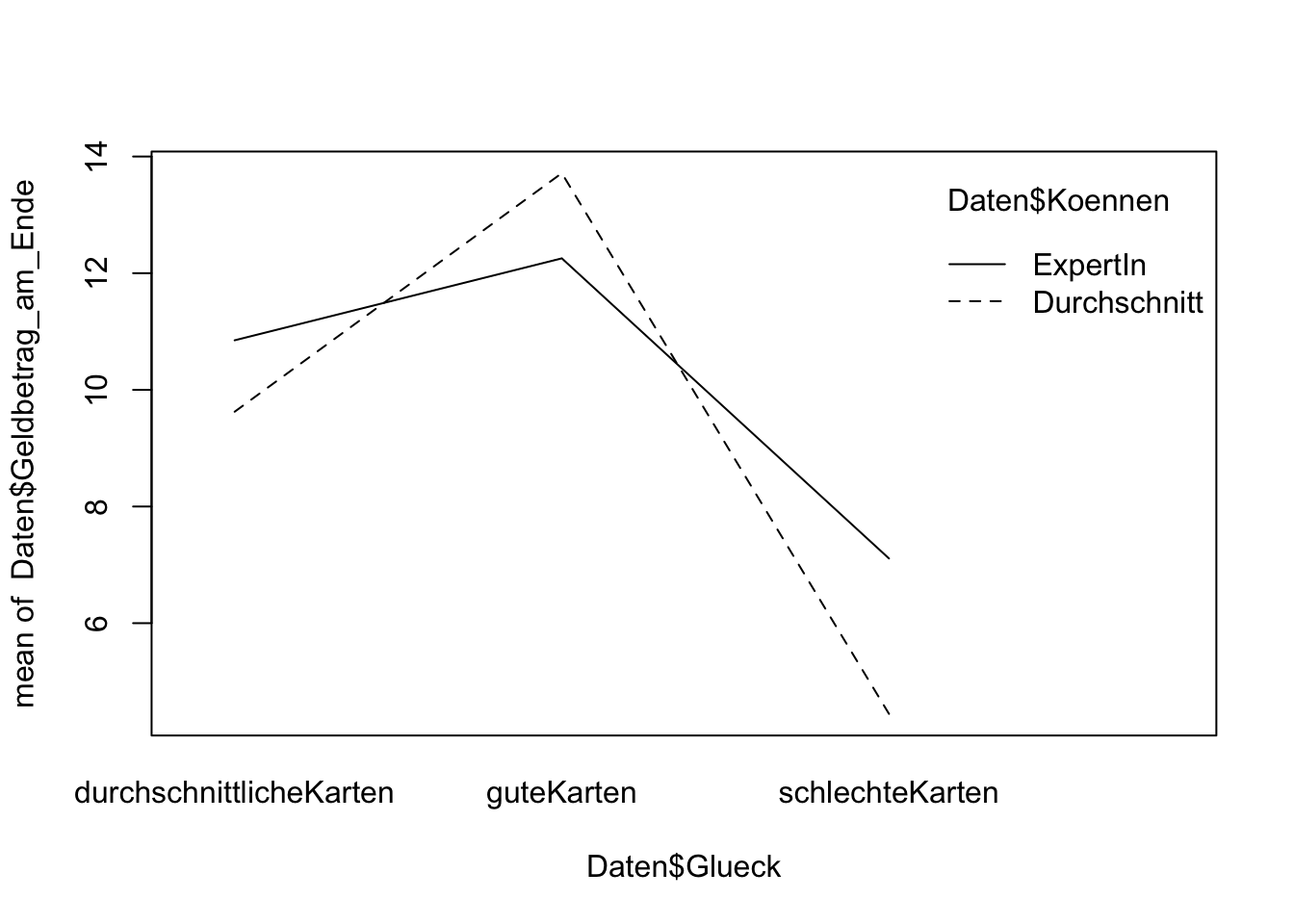 interaction.plot(Daten$Glueck, Daten$Koennen, Daten$Geldbetrag_am_Ende)